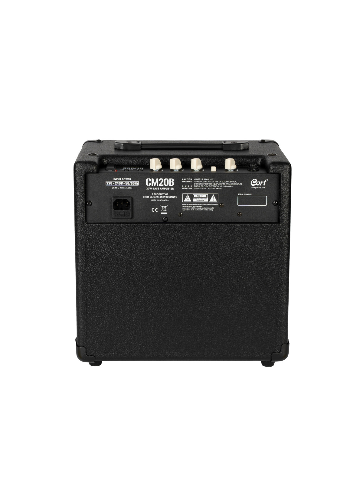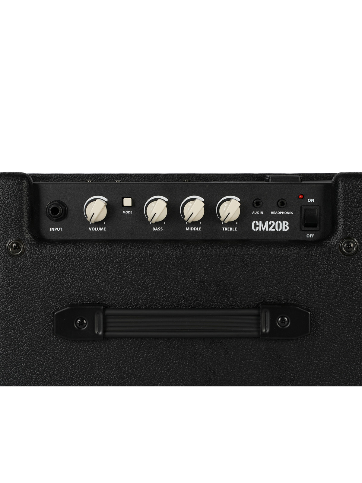 Ampli basse CM20B, 20W, HP 8", égaliseur 3 bandes, bouton Mode (Clean/Gain), entrée auxiliaire, sortie casque, dimensions: 30.5 x 31.5 x 21 cm, poids: 6 kg.