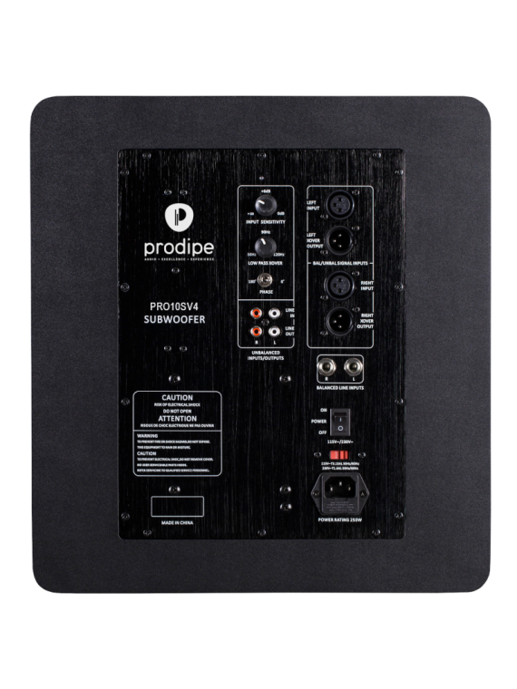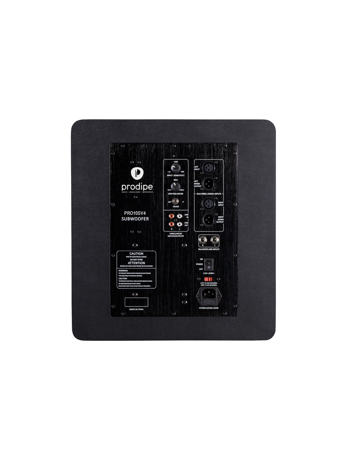Subwoofer Actif Prodipe 10'' - 225 watts BLACK WOOD (Unitaire)Caisson d'Infra-grave professionnel 10"Puissance Dynamique PrécisionCompatible Moniteurs "Pro5 - Pro7 - Pro8"Le subwoofer Pro10S nouvelle génération version v4Nouvelle électronique d'amplification pour plus de dynamique et de précision.Woofer : "fibre de verre", et "filtrage actif"Un woofer désormais équipé d'une membrane en fibre de verre pour plus de rapidité et dynamique.Aimants de transducteurs blindés par des caches en acier anodisés.Renversement de la phase et coupe-haut ajustables.Une qualité sonore constante sans vibration indésirableUn caisson fait d'un bois à forte densité afin de garantir une qualité sonore constante et sans vibration indésirable. Contrairement à de nombreuses autres références, nous avons placé l'évent de type « Bass reflex » sur l'avant afin d'améliorer la décompression sur les basses, ce qui permet un positionnement de l'enceinte bien plus facile.Une connectique complèteLa connectique est complète pour une utilisation universelle : XLR / Jack TRS 6.35 pour une connexion symétrique, et Cinch (RCA) pour une connexion asymétrique.Réglage de filtre manuelPour plus de personnalisation de votre écoute, ce filtre vous permettra de choisir votre fréquence de coupure donc la bande passante que vous enverrez vers vos enceintes de monitoring.Compacte et éléganteUne ligne compacte et élégante, des finitions soignées.Faites d'abord confiance à vos oreilles...Même si à qualité égale nos tarifs restent parmi les plus bas du marché, inutile de comparer ces enceintes monitoring aux 1ers prix d'autres marques ou à des produits bas de gammes... Faites plutôt confiance à vos oreilles !!!La qualité professionnelle enfin accessible au plus grand nombreQue les budgets économisés servent enfin à la promotion des artistes !La "recherche et développement" a été réalisée en France en collaboration active avec l'incontournable ingénieur du son français Ludovic Lanen"Depuis plus de 30 ans, je fais d'abord confiance à mes oreilles plutôt qu'à un tarif car seule la qualité est mon combat ! Un niveau de qualité identique à de nombreuses références professionnelles."SPÉCIFICATIONS :Réponse en fréquence : 36Hz à 150HzFinition : Back WoodAmplification : Type ABWoofer : Membrane en fibre de verre 10” (25cm)Connecteurs d'entrée : 2 x XLR (symétrique)2 x Jack 6.35 (symétrique)2 x RCA (asymétrique)Poids : 18kgPuissance : 150W RMS (270W crêtes)Sorties : 2 x XLR (symétrique)2 x RCA (asymétrique)Impédance des entrées/sorties : 10kODimensions (H x L x P) : 383mm × 355mm × 398mmDistorsion harmonique : 0.05%Rapport signal/bruit : 98dBUtilisation : Studio