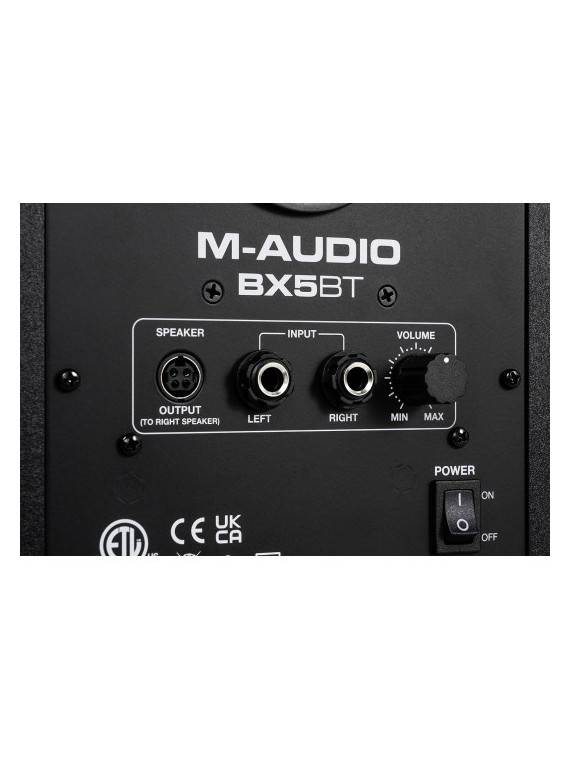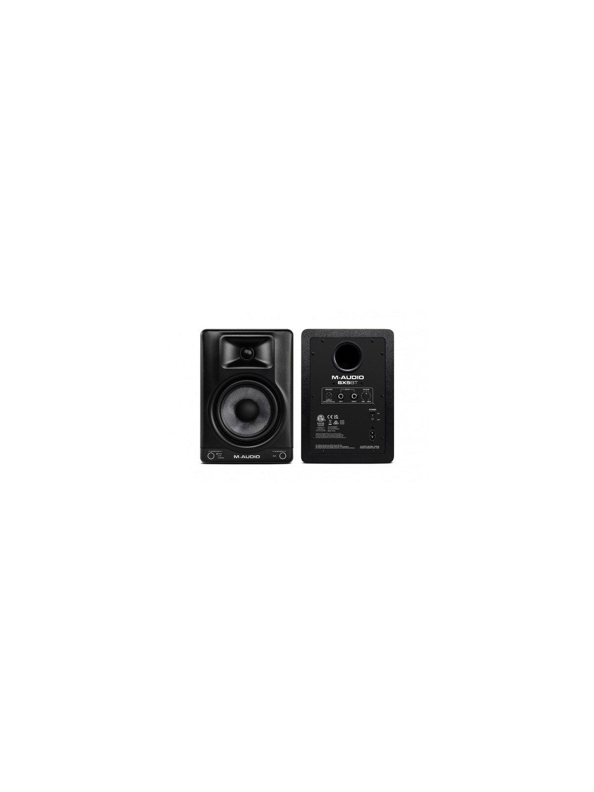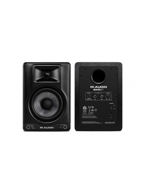 - Amplification : Actif (amplifié)- Bluetooth : Oui- Catégorie : monitoring- Contrôles : volume- Couleur : Noir- DSP : Oui- Diamètre Haut-parleur : 5"- Dimensions (mm) : 254 x 176 x 202- Entrées : 2 x jack- Nombre de voies : 2 voies- Poids : 7,10 kg- Puissance (W) : 120 W- Puissance / type : RMS- SPL max : 109 dB- Structure enceinte : MDF- Type : enceinte active- Specs complémentaires :- Paire d’enceintes de monitoring actives bi-amplifiées, 120W total- Woofer 5” en Kevlar à réponse étendue- Tweeter 1” à dôme souple avec guide d’ondes- Réponse en fréquence : 49 Hz – 20 kHz (-10 dB)- SPL max : 109 dB- Dispersion : 120° × 90°- DSP de précision pour un crossover et une réponse en fréquences optimisés- Convertisseurs Burr-Brown professionnels- Rapport signal/bruit >120 dB- Modes d’écoute FLAT / HYPE / CUSTOM accessibles en façade- Application M-Audio Studio Control App avec EQ 5-bandes et presets personnalisables- Bluetooth 5.0 pour diffusion sans fil haute qualité- 2 entrées jack 6,35 mm TRS symétriques- Connecteur de liaison 4 broches entre l’enceinte active et l’enceinte passive- Contrôle de trim sur la face arrière- Caisson bass-reflex MDF avec finition vinyle- Livré avec 2 pads d'isolation