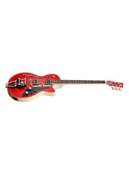 Duesenberg Starplayer TV DUO-TONE HARBOR GREENMancheType: Collé, érable 1 pièceLargeur: 42.5 mm (sillet), 52 mm / (12ème frette)Épaisseur: 21 mm / (1ère frette), 24 mm / (12ème frette)Profil du manche: Medium DTouche: Palissandre, radius 305 mm / 12"Repères: Points crèmeFrettes: 22 Jumbo 2.8 x 1.0 mmDiapason: 648 mm / 25.5"Tige de réglage: Acier double actionCouleur tête: NoireCorpsType: Semi-hollow avec poutre centraleTable: Épicéa laminéDos, éclisses: Épicéa flamméDimensions: 46 x 34 cmHauteur (éclisses): 4.5 cmFilets: 5 plis crèmePlaque de protection: BlackFinition: Vernis polyuréthaneAccastillageMécaniques: Duesenberg Z-TunersChevalet: Duesenberg chevalet avec pontets en acierVibrato: Duesenberg Diamond Deluxe TremoloAttache courroie: Duesenberg Standard (Straplock compatible)Accastillage finition: NickelCordes: Duesenberg Custom 10/50 (010-013-017-028-042-050)ÉlectroniqueMicro (manche): Duesenberg Domino P90Micro (chevalet): Duesenberg Grand Vintage HumbuckerCâblage : 1 Volume, 1 Tonalité, sélecteur 3 positionsAccessoiresHousse: Duesenberg Custom Line CaseOutils: Clés Allen fournies