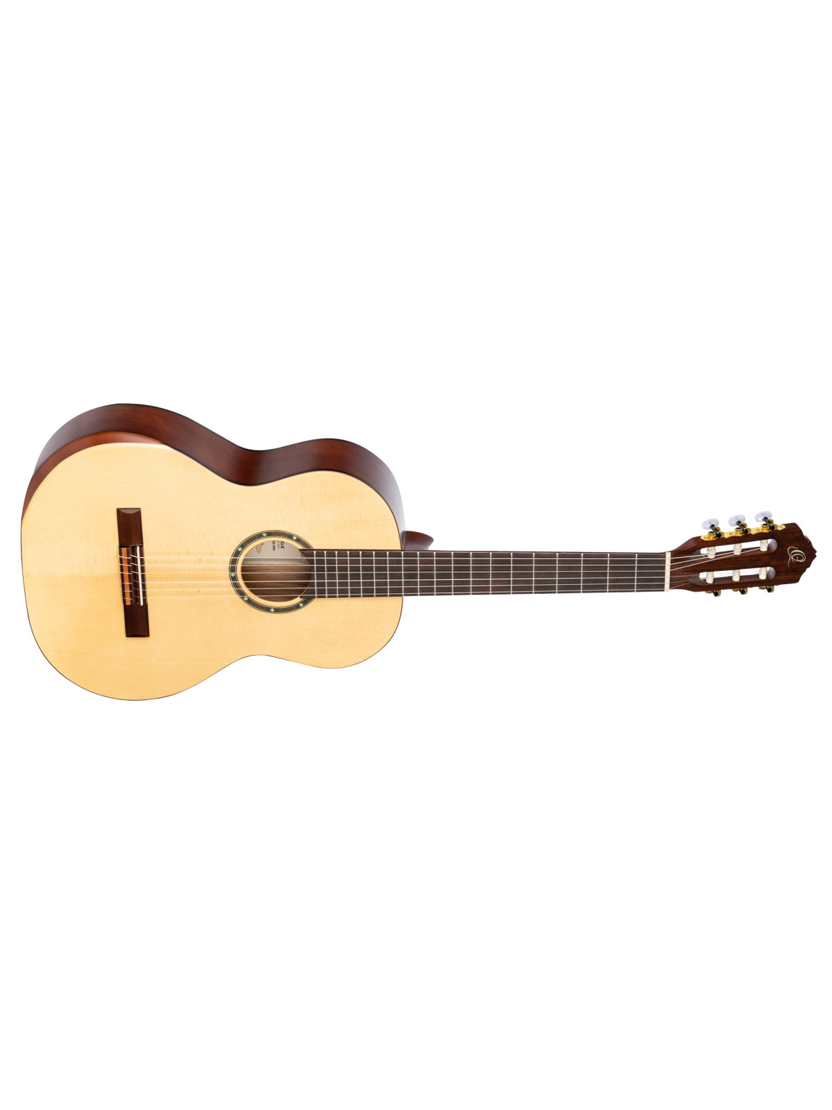 Ortega R55dlx Epicea Massif naturel satinéR55DLX, table épicéa Engelmann massif, fond & éclisses catalpa, manche nato, sillet 52 mm, touche & chevalet noyer, binding ABS noir, placage de tête noyer, truss rod double action, chanfrein.