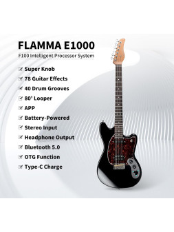 Guitare Electrique Flamma® E1000 Guitare DSP Cyber YellowLa FLAMMA E1000 est une guitare de nouvelle génération, offrant un savoir-faire de haute qualité ainsi qu’une innovation intégrée. La FLAMMA E1000 libère un potentiel créatif infini avec une interface interactive fournissant des préréglages, des boucles de batterie, un métronome et un outil de boucle. Les joueurs peuvent accéder à la créativité et au contrôle via le super bouton de la guitare et l’application FLAMMA, leur permettant d’appliquer et de personnaliser leur sortie. Pas besoin d’amplis encombrants ou de pédaliers complexes, la FLAMMA E1000 est totalement portable en cas de besoin. Et avec un manche en érable torréfié, une finition de corps brillante et une touche en palissandre, la guitare offre également une expérience de jeu élégante, offrant à la fois esthétique et son.Libérez votre son uniqueLe FLAMMA E1000 se connecte facilement à votre téléphone ou tablette via Bluetooth et débloque 78 effets de guitare, 48 boucles de batterie et un looper de 80 secondes via l’application FLAMMA. Les joueurs peuvent manipuler les paramètres de l’application selon leurs préférences précises via le super bouton de la guitare et créer facilement leur configuration idéale. Pour les performances en direct, les joueurs peuvent modifier leurs préréglages en temps réel en connectant le FLAMMA E1000 au pédalier sans fil C4 (à acheter séparément).Connectivité pour une créativité sans finTous les effets, la boîte à rythmes et le looper sont intégrés à l’E1000 lui-même et peuvent donc être facilement transmis à un ampli ou à un haut-parleur via la sortie jack ¼. Les joueurs peuvent également profiter d’une pratique solo sans ampli en connectant simplement une paire d’écouteurs directement à la sortie casque 3,5 mm de la guitare. Grâce à ses capacités Bluetooth, les joueurs peuvent également envoyer l’audio directement dans la sortie FLAMMA E1000. Sélectionnez simplement votre piste sur un mobile ou une tablette, associez-la au FLAMMA E1000 et profitez de la musique sur la piste de votre choix.Capturez votre sonLes joueurs peuvent facilement capturer leur son en connectant le FLAMMA E1000 à un mobile ou une tablette via un câble OTG (à acheter séparément) depuis sa sortie USB-C intégrée. Les joueurs peuvent créer leur propre son unique en utilisant les options d’effets de l’application FLAMMA et le capturer directement avec une application vidéo ou audio. Le FLAMMA E1000 offre tout ce dont vous avez besoin pour créer et innover sans limites.Une guitare de nouvelle générationLe FLAMMA E1000 est un outil tout-en-un pour les guitaristes qui cherchent à faire passer leur jeu au niveau supérieur. En plus d’offrir une construction de haute qualité pour un son exceptionnel, son interactivité signifie plus de potentiel créatif et de meilleurs résultats. Grâce à ses commandes intégrées, les joueurs peuvent s’entraîner, jouer et créer en déplacement avec un accès transparent. L’avenir de la guitare est là avec le FLAMMA E1000.