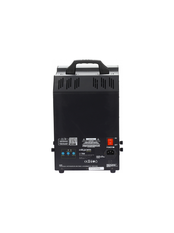 - Accessoires inclus : télécommande sans fil- Compatibilité DMX : Non- Connectique alimentation secteur : Cordon IEC- Consommation totale maximum : 700 W- Couleur : Noir- Couleur de l'appareil : Noir- Dimensions (mm) : 295 x 210 x 350- Indice de protection (IP) : IP20- Lyre de fixation : Non- Orientation : Sol- Poids : 5,50 kg- Puissance (W) : 700 W- Réservoir de liquide (capacité) : 0,50 l- Temps de chauffe (mn) : 3 m- Type d'usage : Soirée, Evènement- Type de liquide compatible :- Bulle : liquide à bulles- Fumée : liquide à fumée densité moyenne- Specs complémentaires :- Puissance : 700W- Temps de chauffe : 2 à 3 minutes- Capacité des 2 réservoirs : 0,5L chacun- Autonomie en fonctionnement continu : environ 15 minutes- Modes disponibles : bulles, fumée, bulles + fumée- Liquide à bulles compatible : liquide à bulles Algam Lighting BUB-ST-1L et BUB-ST-5L- Liquide à fumée compatible : liquide à fumée densité moyenne FOG-MD-5L et FOG-MD-20L- Panneau de contrôle : LED préchauffage, LED machine prête, boutons fumée seulement (FOG), bulles seulement (BUBBLE), et bulles + fumée (BUBBLE FOG)- Livré avec une télécommande sans fil