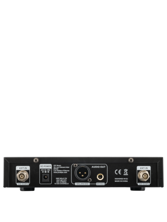 Micro Main Prodipe UHF 100 fréq. True DiversitySystème UHF DSP Solo TD MC1Définition Précision FinesseLa qualité du son filaire en UHF...Le système UHF MC1 DSP Solo True DiversityAprès un succès considérable remporté sur les plus grandes scènes de France, et réputé pour sa réponse neutre, détaillée, sans bosse de présence, son effet de proximité peu marqué et sa directivité pas trop serrée, il nous était impossible de ne pas développer un système sans fil dédié à ce fabuleux micro filaire MC1 .La qualité et la définition du son le plus proche d'un système filaireDésormais disponible en UHF, la cellule du MC1 est hébergée par un tout nouveau design de boitier micro-main en métal, robuste et bien dimensionné, également conçu pour un minimum de bruits de manipulation.Le procédé " True Diversity" pour un équilibre, une stabilité et une restitution jamais vus à ce prix !Nous avons inclus dans notre système MC1 UHF le procédé "True Diversity" permettant une liaison sans faille entre le micro et le boitier récepteur avec plusieurs signaux radio qui travaillent simultanément afin de laisser au récepteur le choix du meilleur signal audio. Une technologie qui permet de retrouver en UHF une stabilité parfaite et une précision audio chirurgicale, pour être l'exact équivalent d’un système filaire. Associé à la cellule du micro MC1, vous bénéficiez en UHF d'un équilibre du son jamais entendu à ce prix.Le monde change, Prodipe suit cette évolution et rend la qualité professionnelle accessible à tous.Avec la mondialisation et la circulation des savoir-faire, un prix élevé n'est donc plus forcément synonyme de qualité.Ne nous croyez pas sur parole, mais au contraire, faites preuve d'esprit de comparaison... et vous comprendrez pourquoi nous nous engageons pour vous.La "recherche et développement" a été réalisée en France en collaboration active avec l'incontournable ingénieur du son français Ludovic Lanen" Quand nous avons décidé de créer le MC-1, nous avons élaboré un cahier des charges très précis.Je souhaitais un micro à la réponse neutre, sans la bosse de présence caractéristique du micro de voix le plus répandu, qui aide certaines voix, mais en durcit exagérément d'autres, dont celle de mon chanteur préféré.J'ai aussi cherché une réponse se rapprochant le plus possible de celle d'un micro statique, mais sans la réaction désagréable de ceux-ci aux sifflantes violentes.J'avais besoin d'un micro avec un effet de proximité peu marqué et une directivité pas trop serrée, donnant au chanteur une certaine liberté de mouvement devant le micro, un peu comme en studio.Nous avons réussi ce pari, le MC-1 répond à tous mes critères d'exigences professionnels. Le Prodipe MC1 s’exprime désormais en UHF tout en conservant les qualités du modèle filaire."SPÉCIFICATIONS :Type de transmission : UHFTrue DiversityNombre d'appareils max : 8 systèmes UHF Solo simultanésNombre de canaux : 100Bande passante : 553MHz à 578MHzDistorsion harmonique : Inférieure à 0.1%Portée : 80mConditions extérieures optimalesRapport signal/bruit : supérieur à 96dBSystème UHF : Module DSP Haute FidélitéCircuit super anti-brouillageStabilité des fréquences : 30PPMAccessoires fournis : PinceAlimentation secteurUtilisation : Backline (scène)Chant / VoixTRANSMETTEURType de micro : DynamiqueDirectivité : CardioïdeRéponse en fréquence : 50Hz à 16kHzSensibilité : -55dB ±3dB (0dB pour 1V/Pa à 1kHz)Puissance : 3 à 8mWAlimentation : 2 piles LR6 (AA) de 1.5VPiles non fourniesEnviron 8h d'autonomiePoids : 340gDimensions : ø52 x 255mmRéCEPTEURSensibilité : Inférieure à -94dBmPoids : 860gRéponse en fréquence : 30Hz à 20kHzSorties : XLR (symétrique)Jack 6.35 (asymétrique)Dimensions (H x L x P) : 50mm x 220mm x 210mm